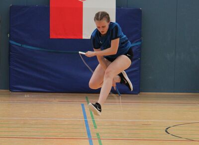 Nach der Mittagspause startete der E3 und E4F Wettkampf. Hier gingen insgesamt 10 Springerinnen für die TGS an den Start. Nach den Speed- und Double Under-Disziplinen, bei denen sich einige bereits über persönliche Bestleistungen freien konnten, folgten die Freestyles. Die Teilnehmer*innen springen eine eigens gewählte Choreografie auf Musik, wobei die Schwierigkeit und die Kreativität der Sprünge bewertet werden.